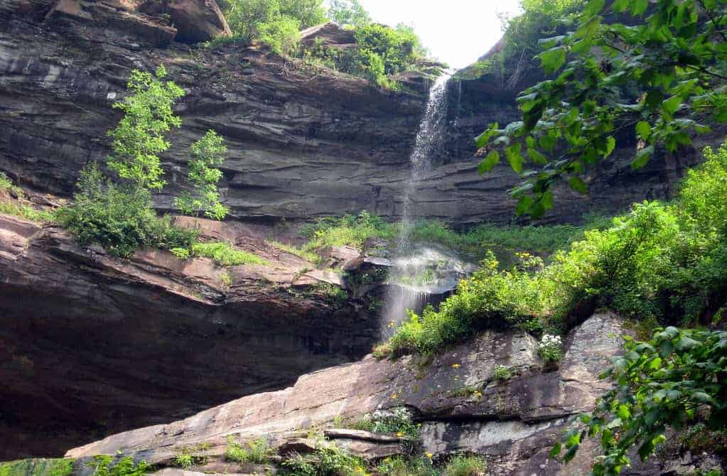 Kaaterskill Falls is a two-tiered waterfall located in Greene County at the eastern edge of the Catskills. It is one of the most famous waterfalls in New York State and has been featured in numerous paintings and photographs throughout history. The falls are accessible via a short hike on a marked trail.